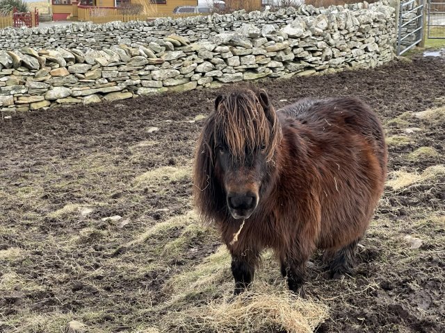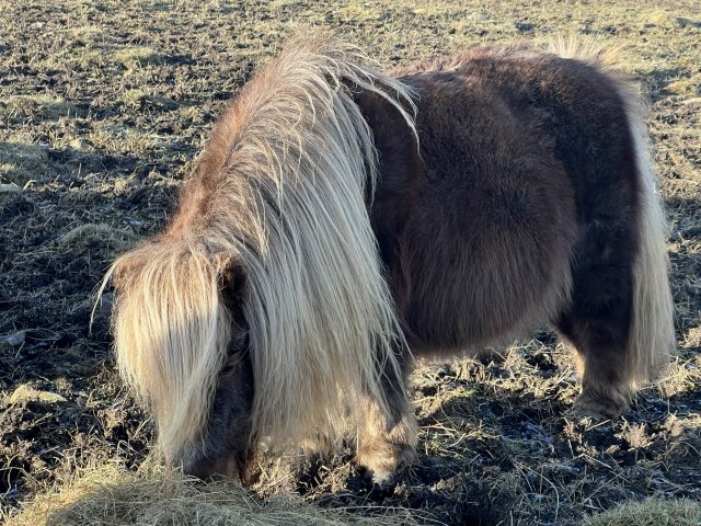 Paloma is a fabulous liver chestnut mare who definitely has the look of her Sire. She has a lovely nature and we are very pleased with her and although you shouldn't have favourites she is up there! Paloma was shown in 2018 where she was placed third at the Cunningsburgh show with her lovely filly foal Gue Tarah. Tarah has done very well for the Abbeygreen Stud in Scotland. Paloma also did very well with Reece Macleod in the Young Handler Class at the 2019 Breed Show - Reece won his age group and went on to win Overall Young Handler. Reece had never handled Paloma until the day of the show so all credit to him. Paloma's 2 year old filly, Gue Xena, who is with the Lochfleet stud, was best miniature and overall reserve champion at the Tayside Foal Show in December 2024. Paloma has been tested as a mushroom carrier - Mu/N. We are very pleased with her 2020 colt foal - Gue Viking - who we have retained as a stallion. She has been tested and is clear of Skeletal Atavism.