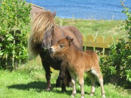 Gue Lily is the only filly that Gue Delight produced so is special to us. Lily has very unusual colouring, in fact, when we asked visitors to the stud over the Breed show period in 2019 no one was sure what colour she was (we think she is chestnut with a lot of white hairs through her coat). Lily had her first foal Gue Unst in 2019 - a lovely colt. Unst has done well in his first show on the Mainland - he gained a second place for best miniature colt born in 2019/20 at the National Stallion show. Lily's second foal is a lovely bay filly from Tot of Berry who is now in Orkney. Lily is the only one of our ponies who, when tested, came back N/Del 1 which means she does carry the SA gene. She has had 3 foals, Unst has tested clear, Xaviera has not yet been tested and Gue Zoe, last year's foal, was a carrier, however, she was a lovely filly and has been sold to a showing home. We are keeping Lily and hope to get a filly from her to continue the line. She will run with a stallion who is SA clear again this year.