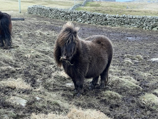 Gue Rebecca is a lovely mare with an excellent temperament. We are very glad to have her as we have sold her sire Lignite Chickadee (Chico). Chico gained a silver award at the Shetland Pony Evaluation Scheme. Rebecca was third placed miniature filly foal at the 2016 Cunningsburgh Show and second placed miniature filly foal at the 2016 Viking Show. Rebecca continues to mature well and as a result she had a first place at the Cunningsburgh show and ended up with Miniature Junior Champion there. She was third placed at the Viking show and third at the Youngstock Show in a mixed class and was top miniature in the 2/3 year old filly class at that show. Rebecca has had a very pretty tri-colour filly foal in 2022, Xtra Special who we have retained. Rebecca has been scanned in foal for 2025. She has been tested and is clear of Skeletal Atavism.