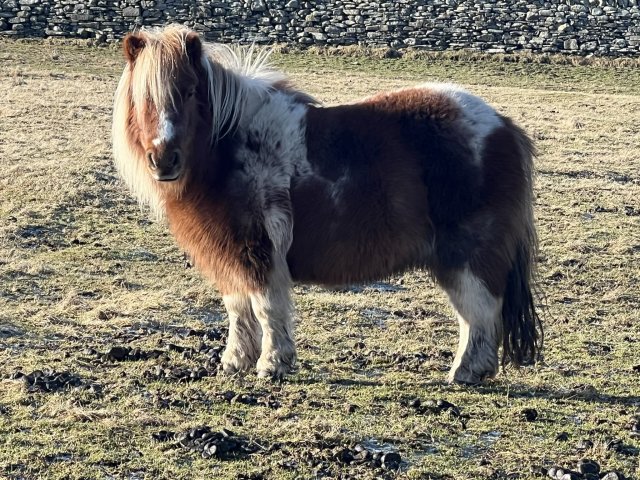 Arabella is a striking skewbald with a fabulous mane and tail. She has already done very well for us in the showring in Shetland - having previously achieved good results for the Milday stud in Scotland. She has a lovely nature too which was evident when we took her into the local care centre for a Christmas treat for the residents. Arabella was second placed 3 year old miniature filly at the 2019 Breed Show in Shetland. Arabella had a lovely colt foal, Gue Whalsay, in 2021. Her 2023 foal Gue Yousa had a difficult start in life but has matured beautifully and has been retained. She has been tested and is clear of Skeletal Atavism.