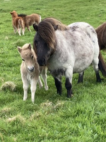 A gorgeous mare with a neat head and lovely eye. Olivia was second placed filly foal at the 2013 Cunningsburgh Show in a large mixed class and was only beaten by Gue Opal. She managed to reverse this in the miniature ring of the 2013 Viking Show by knocking Opal off her perch into second place. Both judges said it was very difficult to chose between them. She rounded off a good year by being second placed filly foal in a mixed class at the 2013 Youngstock show. Olivia had another good year in the showring in 2014 - she attended 3 shows where she got a second place and two first places, a Reserve Junior champion, Junior champion and reserve ring champion. She also won two progeny classes with Gue Paolo. At the 2017 Viking Show she was second placed mare with foal at foot with her lovely filly foal Gue Sophie May whom we have retained. Olivia excelled herself in 2019 producing a striking mushroom colt, Gue Uproar, for us. Uproar was first placed miniature colt at the 2019 Breed Show and has been retained by us as a stallion. Olivia herself was second placed miniature brood mare in a large class. She continues to mature and improve every year doing extremely well in the showring in 2023 winning her class at 3 different shows. Olivia has been tested and is a mushroom carrier - Mu/N. Olivia produced a lovely mushroom filly Gue Winsome in 2021 who we have retained. In 2023 the pairing of Gue Olivia and Brandon Fiery Jack produced a strong chestnut colt, Gue Yeats. We have sadly had to sell Yeats as he is too closely related to our current stock. Olivia has been tested and is clear of Skeletal Atavism. Olivia has been scanned in foal for 2025.
